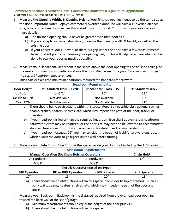 BLUE = GO TO Commercial Sectional Overhead Door Measurements